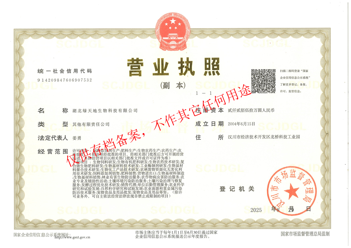 湖北綠天地生物科技有限公司 (簡稱綠天地公司)投資7000萬元,擁有25000平方米的廠房和國內先進的設備360臺套,建有微生物發酵、發酵冷凍干燥、低溫造粒等8個車間,發酵罐總容量450立方米,專業的飼用級益生菌發酵生產基地。 公司已通過IS09001:2015質量管理體系認證。 綠天地公司得到了華中農業大學、中國農...